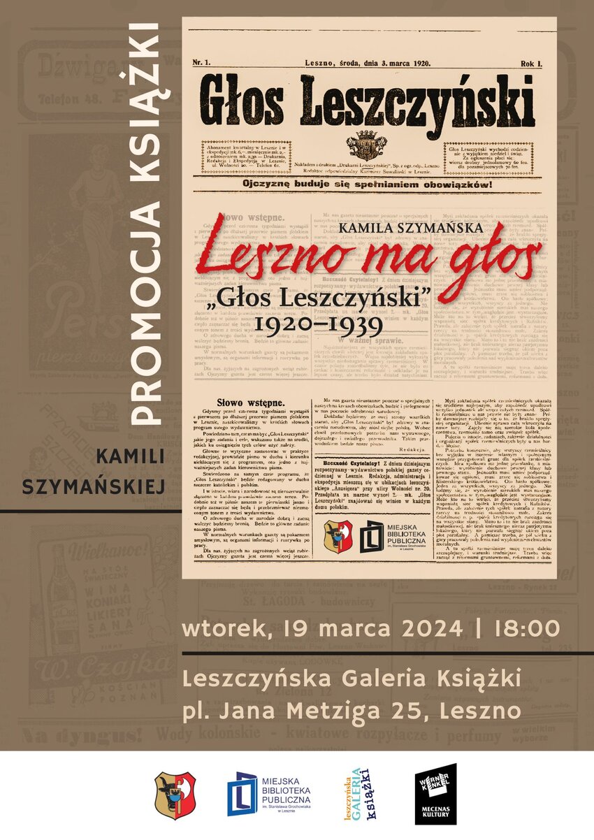 Miasto Leszno oraz Miejska Biblioteka Publiczna im. Stanisława Grochowiaka w Lesznie serdecznie zapraszają na promocję książki dr Kamili Szymańskiej pt. Leszno ma głos. "Głos Leszczyński" 1920-1939.