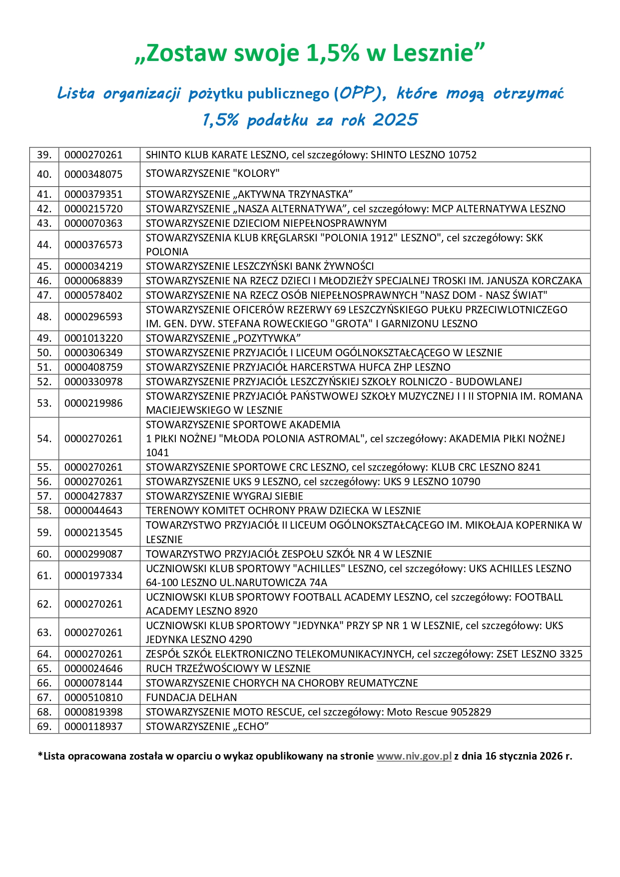 Zbliża się czas rozliczeń z podatku za 2025 rok z Urzędem Skarbowym. Zapraszamy mieszkańców do zapoznania się z wykazem leszczyńskich OPP. Już dziś możesz zdecydować, której leszczyńskiej organizacji pożytku publicznego przekażesz swoje 1,5% podatku.