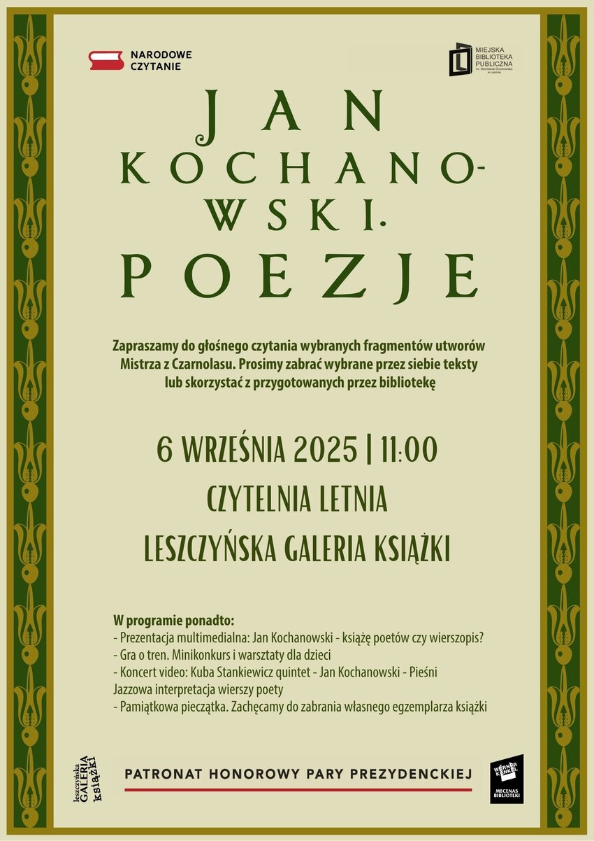 Miejska Biblioteka Publiczna im. Stanisława Grochowiaka w Lesznie zaprasza do udziału w 14. edycji Narodowego Czytania! Tegoroczna akcja będzie poświęcona twórczości Jana Kochanowskiego. Spotykamy się 6 września 2025, o godz. 11:00, w Czytelni Letniej Leszczyńskiej Galerii Książki (pl. Jana Metziga 25). Wstęp wolny!