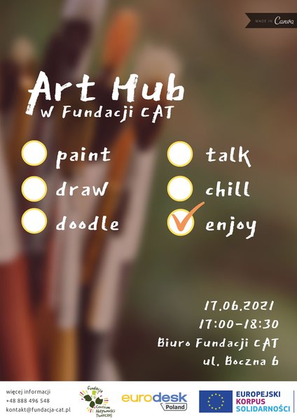 Są to pierwsze warsztaty Art Hub organizowane przez Fundację Centrum Aktywności Twórczej. Na warsztatach będzie można cieszyć się kreatywną atmosferą, gdzie każdy będzie mógł rysować i malować bez żadnych zasad i ograniczeń. Nie są wymagane wysokie umiejętności artystyczne ani materiały, wystarczy przynieść dobry humor, chęć do zabawy i dać się ponieść kreatywności!