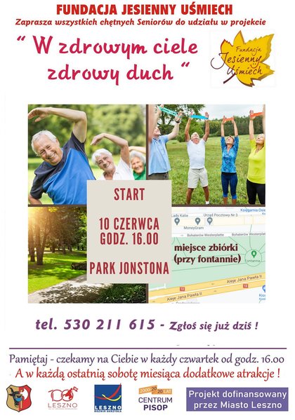 Fundacja Jesienny Uśmiech zaprasza Seniorów w każdy czwartek od godz. 16.00 na gimnastykę do Parku Jonstona w Lesznie. Ćwiczenia są bezpłatne i będą odbywać się na otwartym terenie pod okiem trenera z uprawnieniami do pracy z seniorami.