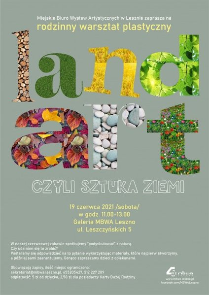 Miejskie Biuro Wystaw Artystycznych w Lesznie zaprasza na rodzinny warsztat plastyczny Land art, czyli sztuka Ziemi. W zabawie uczestnicy spróbują "podyskutować" z naturą. Czy uda się to zrobić? Jeśli chcesz się przekonać zapisz się na warsztaty i dołącz do grupy odkrywców.